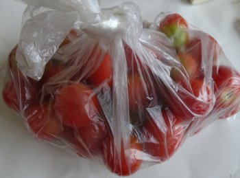 Uさん栽培のミニトマトです。甘夏のお返しだと思うんですけど、甘夏は「勝手に収穫してね」ですが、ミニトマトは「割れちゃうの。割れてないのを選んで入れた」と面倒ですね。もう実割れしてるんだ。私の黄ミニトマトはまだ割れてない、というか熟してないからだけど。