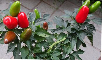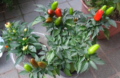 鑑賞用トウガラシが色付き始めました。実が大きいトウガラシは色がオレンジ色留まりと思っていましたが、それは間違いで赤くなるんですね。黒ずんだオレンジ色は熟し始めの色です。