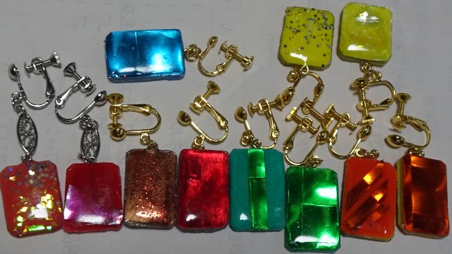 先生に金具を付けて頂きました。表裏で配置しています。前列左は途中に楕円の飾りが付いてるでしょ?こうすると手間が二重になるんだけど「こうもできる」と先生の提案でした。「手間がかかっても先生だから(良いことを教えなくちゃいけない)」とのこと。後段左の青のもう1個は塗り直しなので、持っていきませんでした。