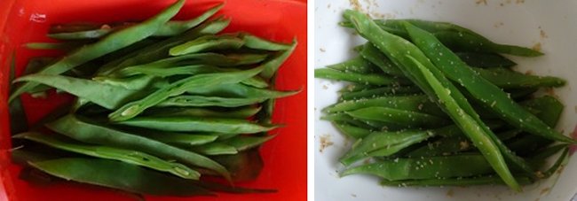 インゲンと少~し水を入れてチンが3分、何も味付けしなくてもこれだけで十分野菜の甘さがあって美味しいね。右は胡麻和え、半分ほど食べちゃったら、なぜか画像が保存されてなくて撮り直ししたものです。これは満足なおいしさ。