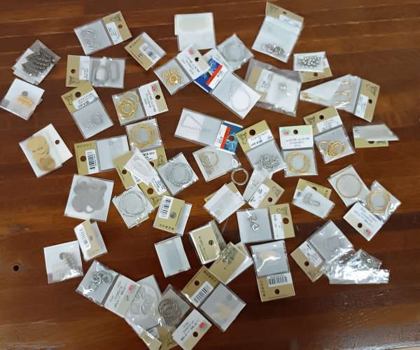 先生が広げた金具類。どう使うか分からないものが大半ですが、センスがよければ上手く使えるかも。