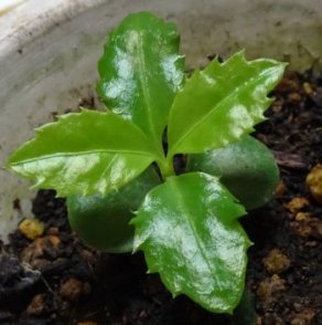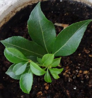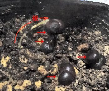 左はキミノセンリョウです。本葉が4枚になっています。なかなか伸びないですねぇ。右はオニユリのムカゴです。均等に間を空けて植えた筈なのに...と思ったら根が地中に入らず、地上に伸びていたからです。根の部分にそっと土をかぶせるべき?