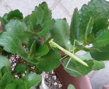 カランコエの鉢に黄緑の線が見えて、一瞬(葉が枯れ落ちて茎だけ残ってるの?)と思いましたが、春に産まれて中サイズのカマキリでした。カランコエも葉に穴が開いてたりするから虫がいるのかもしれません。ここは玄関前で草がないからあまり虫はいないと思うんだよね。