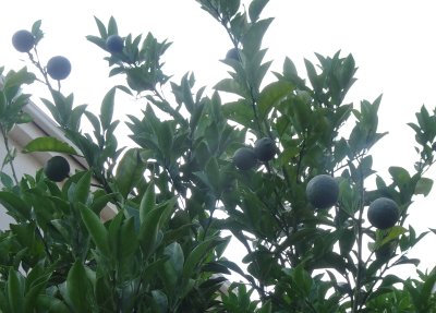 甘夏の木、天辺の方だけ沢山実ができています。大きくなっても摘めないかも。