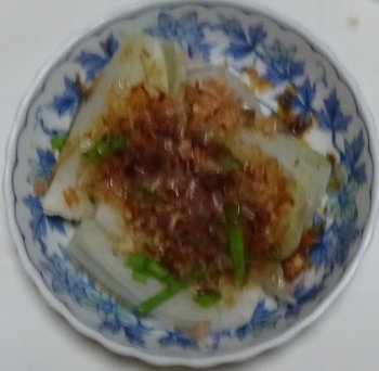 「丸ごとタマネギのおかかポン酢」を作ってみました。1個を電子レンジで5分、細ネギと花かつお、ポン酢醤油、ごま油をかけて出来上がり。超簡単に出来上がって美味しいんだけど、私にはタマネギが甘すぎた。
