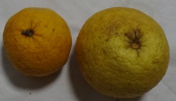 木に生らせたままだった甘夏が落果。左が通常収穫のもので落下したのが右。ずっしり重いんだけど中身はスカスカになってないかしら?