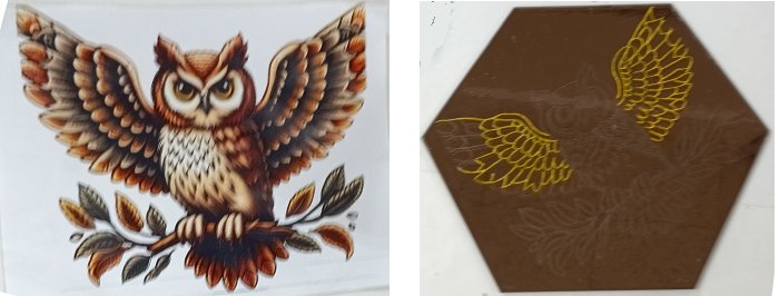 Mさんの作業です。左は図案、右は6角形の鏡なんですけど、線描きをしてるところ。気をつけて見ると、うっすらと下書きの線がみえます。線が見えにくい上に材質的に絵具が載らないらしい。大変だね。