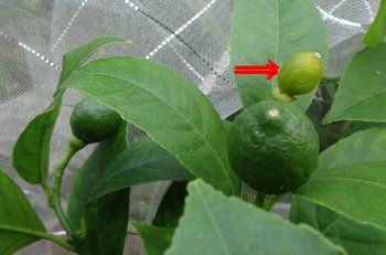 レモンの実が大きくなりつつあるけど、落果するものを発見しました。矢印の実はいかにも「もうダメです」という感じで触ったらポロっと落ちました。ここは側枝が3本に分かれ、そこに4個実が着いてるので当然なんですね。