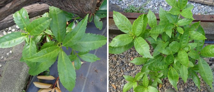 戦力外(?)のセンリョウです。左はカルミアの根元に生えてきたもの。右は隣家との境界に生えたものですが、こんな大株になるってことは実生からもう4年目にはなってるんでしょうね。「どうしたら実が着く?植える場所は?」と悩んだのが嘘みたいに着果がいいです。結局は花が咲く時期の雨ですかね?