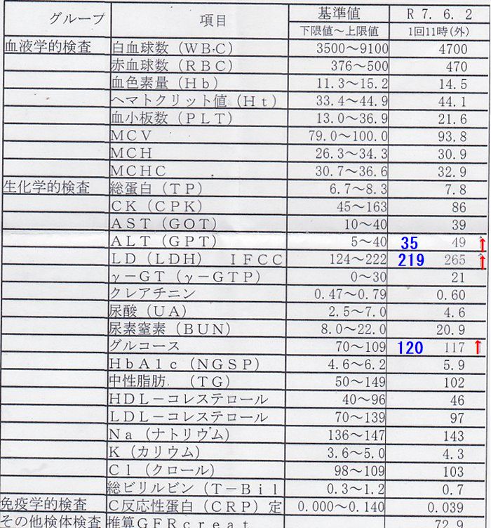 肝臓、心臓、腎臓、筋肉、血液などの疾患の診断や、病気の進行度を把握するのに役立つ」とのこと。グルコースは「血糖値を測定する検査で、糖尿病の診断や管理に役立つ」とのことです。いつも食事を抜いてなくて今回はちゃんと抜いたので数値が少し下がったのかな?青色の数字は前回のもので私が記入しました。