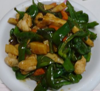 姉のピーマンを使ったチンジャオロースです。残っていた10㎝ほどの人参1本、タケノコ水煮、鶏肉を炒めてcookdoのタレを絡めてオシマイ。