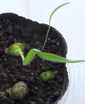 ムカゴから葉が出るとこんな風です。幅広の葉がクネクネ曲がっているのは上に透明の蓋を被せて頭がつかえたからで、蓋を被せてるのはアメに齧られない為です。これは薄ピンクの花のムカゴです。ネットで注文したムカゴからはまだ葉が出ていません。