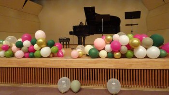 ニューイヤーコンサート、演奏前に舞台を写しました。手前にあるのは風船なんですが、9時から膨らませて準備したらしいのですが時ならずバンと破裂するという。ソプラノのIさんが、「椿姫」より「乾杯の歌」を歌うのですが、説明して「男声なんです」と言い終わったら