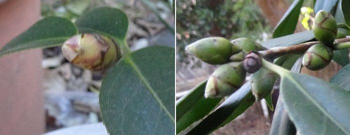 コチラは椿です。左は挿し木なんですが、どれを挿したか覚えていない。右は白の侘助です。今年はいっぱい咲きそう。椿はネットで研究し、時期毎に肥料をあげ大事にしてきました。サザンカも調べればいいのかなあ。