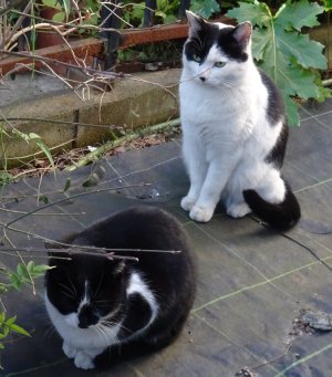 ロウバイの写真を写すためだけに庭に出て白猫を発見、(あら、いたの?)くらいに思ってて帰りに見たらもういない。(ご飯要らないのね)と玄関に戻ったら、先回りしてちゃんと二匹で待ってました。鳴いてせがまなくても貰えると思っているのかじっとしています。