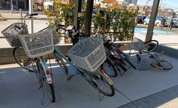 風が強く自転車がなぎ倒されています。一番左が私の自転車で辛うじて持ちこたえています。こういうの、ほどくのが大変なのよね。私の自転車をもっと左に寄せたら隣の自転車はガシャ~ンと倒れちゃいました。片手で立たせてたんだけど風が強くて又倒れてくるので仕方なかったよ。