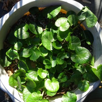 勝手に種が落ちて一年で鉢いっぱいに広がったヒメリュウキンカです。Tさんのところではもうとっくに咲いてて、見ると道路のT字路位置に鉢が置かれ、早朝から陽があたってるんですね。これはいつ咲いてくれるかな?