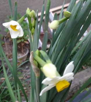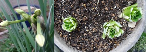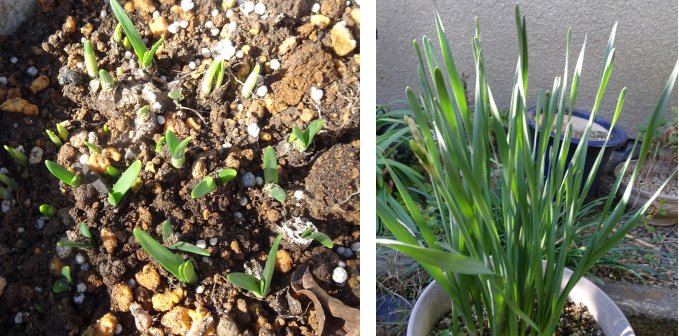 同じ水仙でも品種によって咲く時期が随分違う。左はティタティタ、なかなか芽が出ないので(消滅したかなあ)と心配でしたね。右は一番早い日本水仙、もう咲きそうなくらいに蕾が膨らんでいます。
