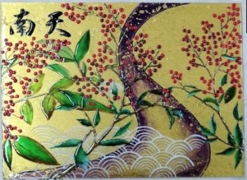 Mさんの自宅での作品。「赤い実を1個1個描いたのよ」とMさんは自慢そう。別に驚かないよ、当然でしょ?でも、そういうからにはかなり面倒だったんでしょうね。