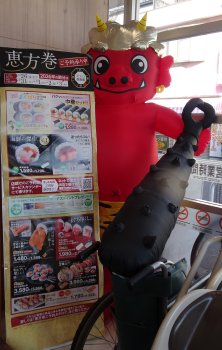 ヨークマートで飾られている鬼です。以前は恵方巻の看板がなくて全身が見られたんですが...今は何故か隣に車椅子もあって鬼は狭苦しそうです。