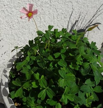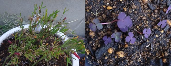 右:オキザリス・サンラック? パーシカラーの鉢に勝手に生えていて去年も別鉢に分けたような気がするんだけどどこにも見当たりません。濃いピンクの花を咲かすんだけど、チラホラとしか咲かないのでつまらないと私は思う。紫葉を楽しめばいいのかも。