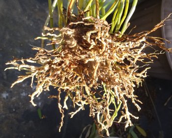 11日に植えたセッコクは何の変化も無い。それは良い事だと思うのだが、変化があっても気付かないかもしれない。現在、葉の付いたバルブを数えたら8本、葉のないバルブから高芽らしい突起が出てるのだけど、これ、以前にあったかなあ?前は根ばかり見てたから全然記憶にない。