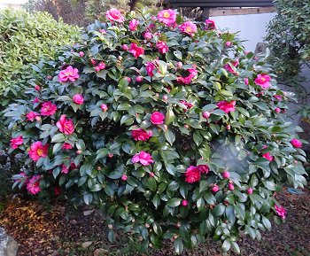 サザンカが満開。品種は分からないけど、多分ありふれた品種だろうと思う。植木屋が剪定・消毒してくれてる以外は肥料もあげないしほったらかしで毎年よく咲きます。