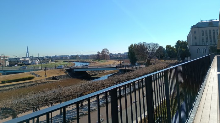 水郷テラスからの展望です。右端の建物が中央市民会館、前が藤棚、沿道に車が停まってるのは市役所の駐車料金がかかるから?