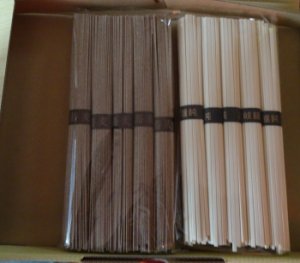 お歳暮に頂いた麺類ですが、左側にあった5束は食べちゃいました。さすが讃岐うどんで腰があり美味しかったです。茶色の5束はうどんにお茶か何か混じってるのだろうと思っていました。見れば分かるせいか何の説明書も入ってないし、箱にもなにも書いてない。でも結束テープには「蕎麦」と書いてありました。最初包装紙に「干しうどん」と書いてあったから全部うどんだと思い込んでしまったのね。