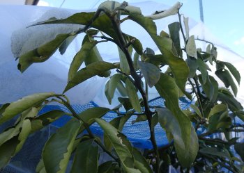 今朝の最低気温はマイナス4℃でレモンの耐寒温度を超えていますね。二階に置いてるから勿論無事だけど。画像はUさんのレモンです。防寒のものを被せてるのだけどそこからはみ出ている枝の葉が縮んでいます。