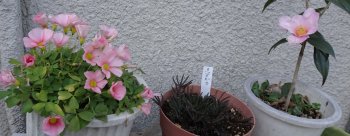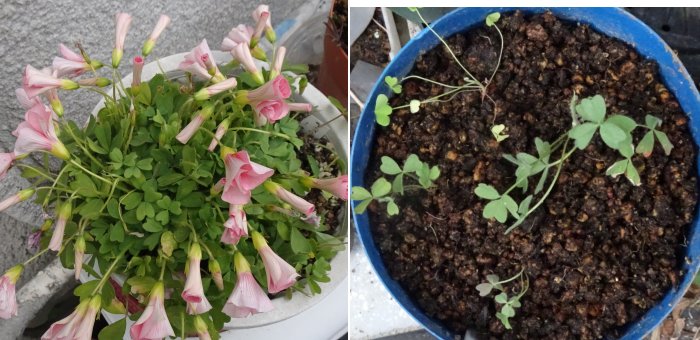 曇りなので花が閉じていますが、このオキザリスはよく咲いて花期も長い。Tさんが欲しがった。「グリーンベルトの舗装予定みたいなところから拾ってきた」ので採りに行ったらもう舗装されちゃって無くなってました。鉢の縁から小苗をそっと掘り返して4苗だけ新しい鉢へ移植しました(右)。