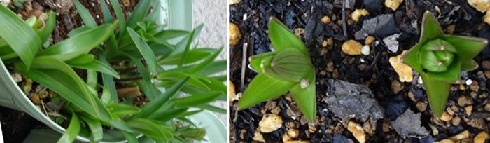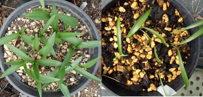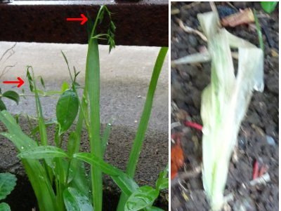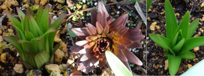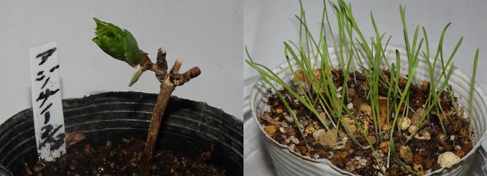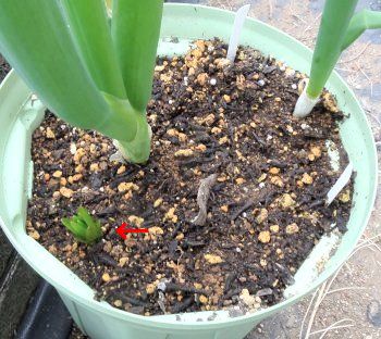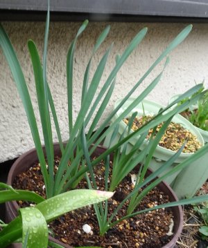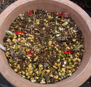 右側は降雪にやられた苗です。掘ってみたら一応球根はできていたので鉢に移動しました。