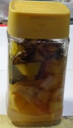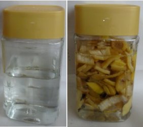 2日しか経っていないけど水が濁ってきたからペットボトルに開けてみました。ボトル1/3っくらいだから180㏄できました。使った皮は庭の土に埋め、再度新しい皮で液肥を作成ちゅう。