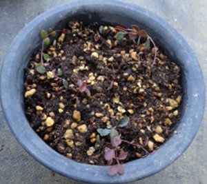 種蒔きして1年経過のチェッカーベリーです。鹿沼土4・赤玉土4・ピートモス2の混合土に透明プラスチックに入れ、乾かないように蓋をしてずっと室内に置いていました。