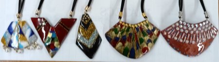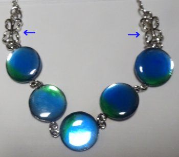 先生にチェーンを付けていただいて1年ぶりに出来上がったネックレスです。青の矢印で示した飾りはただのチェーンではなく「これを使おうか」と先生が工夫してくれたものです。皆が「素敵!」と褒めてくれました。この円のパーツは鏡面になっているので反射した光がキレイなんです。皆で話題にして「もうこのパーツはない」とのこと。(^^;