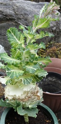 Tさんの寄せ植えにあったハボタンです。踊りハボタンをやってみたくて貰ってきました。上を3cmほどチョキン、下の枯れっぽい白い葉を摘み取りました。あとどうするんですかね?
