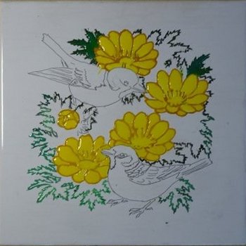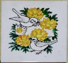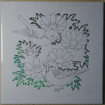 「雀と福寿草」なんだけど、ギザギザの福寿草の葉の輪郭を塗るだけで3時間もかかっちゃった。線描きにはソリッドという液を使う。途中で切れちゃったから再度絞り出して絵具と混ぜた。だから色が違っちゃいましたね。