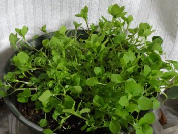 姉は笑うけれど、ハコベです。たかがハコベでも今の時期に草姿をこんもりとさせるのは難しいですよ。窓ガラスとカーテンの間において時々液肥も与えています。鳥たちに与えるために摘んだから少し乱れているけれど1日で形が復活します。