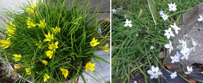 左はイフェイオン、右はハナニラ、と園芸店で売ってるらしいけど、どちらも同じイフェイオン属で左は黄花ハナニラとも言ううらしい。花色だけじゃなく葉っぱも違うので同属だとは思えない。球根が密になっても咲くのがいいね。