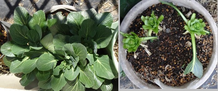 リボベジの小松菜です。立派になって小さな蕾も見え出したので切って食べました。柔らかくておいしかったです。残した根っこ部分に土増しして肥料をあげておきました。