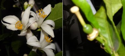 左はマイヤーレモンの花ですが、不完全花も混じっていて、メシベが無いんですね。受粉しようと筆を近づけるとすぐポロっと落ちちゃいます。右はリスボンで結実したらしいですが、これでも落果したりするみたい。