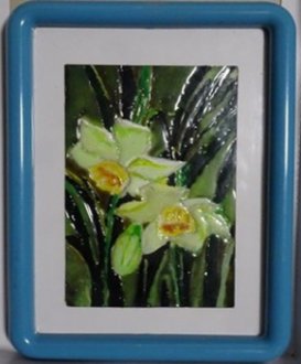 いつかは描きたいと思ってた水仙の絵です。花より背景の色が難しかったですねぇ。一度塗った色が暗すぎて塗り直しましたよ。この額縁はいただいたものなんだけど、中には薄い布の絵が入っていたんです。その絵は捨てて1㎜のアクリル板を入れたんだけど、厚くて裏蓋が閉じられない。そこで厚紙を切って裏蓋にしました。