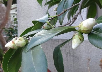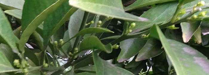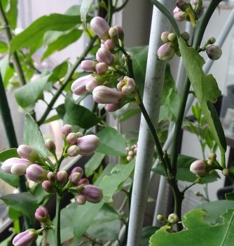 2本あるマイヤーレモンのうち、去年実を付けた方の木の蕾数が10個以上の塊になってて、もう一方の木は2~3個の塊になっています。結実した方の木は(疲れたなあ)って感じなのかしら?