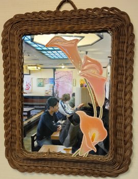 ここのお店には樹脂工芸のタイルを壁に飾っているのだけど、鏡もあったことに気付きました。籐細工のフレームで、樹脂の絵はカラーの花です。
