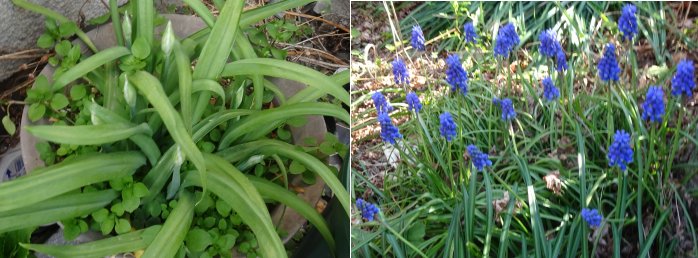 左はシラー・カンパニュラータ白花の蕾です。別名スパニッシュ・ブルーベル。2つの名をどこが違う花なのかと思っていたら別名なんですね。右はムスカリ、すごく増える。そして、どうも自分の好きなところに移動(種がこぼれる)して繁殖する。間違えて球根を掘ってしまっても惜しげもなく捨てています。