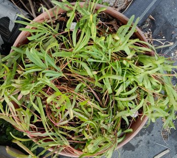 ゼフィランサス・タマスダレです。上部は枯れた葉が沢山で非常にみっともなかったのですが、鉢をひっくり返すと中は根がびっしりで土はどこにあるの?状態でした。千切れようが何だろうが絡まった根をほどいたら3倍ほどに増えていました。鉢2つに植えたけれど余っちゃいました。残りは出鱈目に地植えしました。苗が増え過ぎる、新しい土が無い、これが植え替えを億劫に思う理由なんですよね。