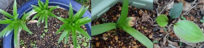 ピンクスカシユリ、増えそうなので植え替えをしていないが多分咲くと思います。真中は黄色のスカシユリで木子からの発芽です。増えて欲しいのに意外と増えない。元の球根は1つのまま分球しなかった。右はカメレオン、土が悪かったのか元の球根は咲かないまま消滅し、小さな小さな木子1つしか残ってない。これら以外で、鬼百合、黄金鬼百合、無斑点黄金鬼百合のムカゴ植えがあります。