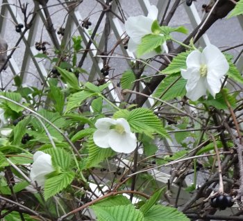 右はシロヤマブキ。葉っぱも花も好きなんだけど、枯れ枝があり全体的に美しくないのは手入れの仕方が悪いのだろうね。