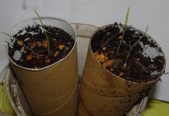ユリのムカゴから発芽。左は我が家にある赤のスカシユリで、右は購入した無斑点黄金スカシユリだと思う。右はムカゴが小さくて充実してなかったのではないか。