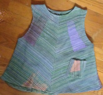 配色が素敵な春用ベスト。織り目が斜めになったり、模様の色が長方形に入ったり、不思議です。